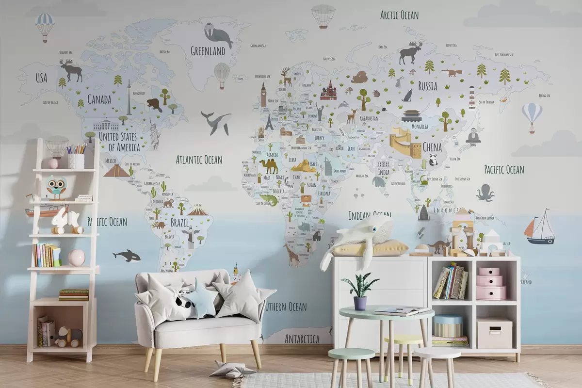 Fototapet Världskarta med djur och landmärken Nr. w03410