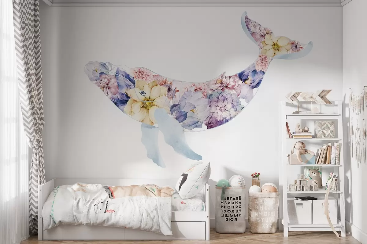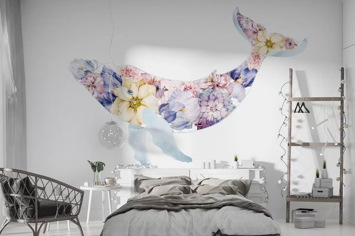 Fototapet Vacker val med akvarellblommor, havsdjur, färgglada Nr. w03445