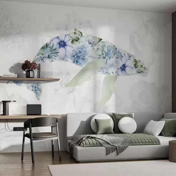 Fototapet Val med akvarellblommor, havsdjur, minimalism, blått och grönt Nr. w03446v2