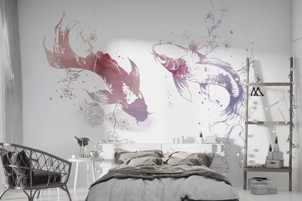 Fototapet Akvarellfisk, orientalisk stil, körsbärsträd, lila färger Nr. w03447v1