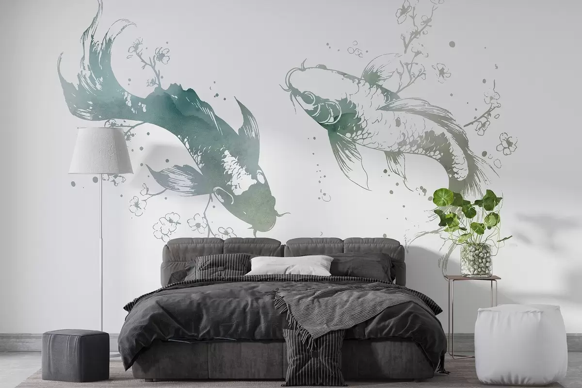 Fototapet Akvarellfisk, orientalisk stil, körsbärsträd, gröna färger Nr. w03447v2