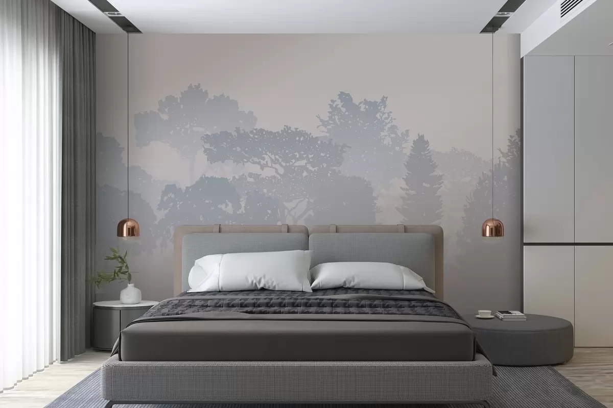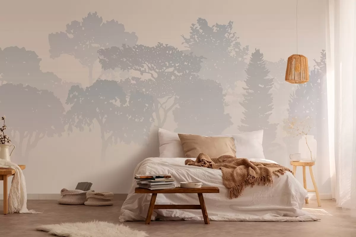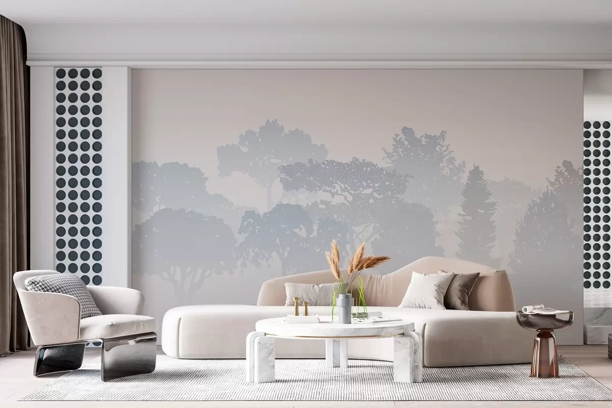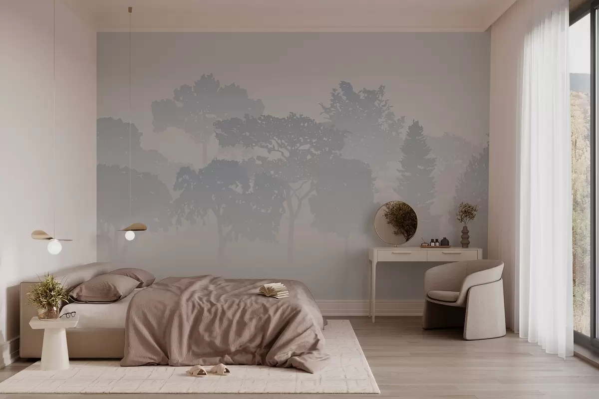 Fototapet silhuetter av träd i dimman av dimma Nr. w03451