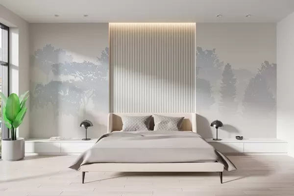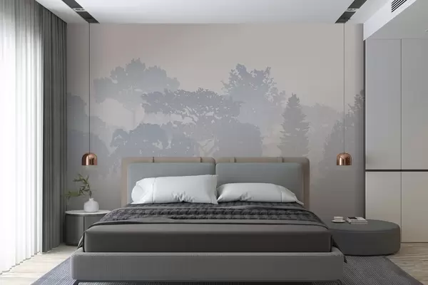 Fototapet silhuetter av träd i dimman av dimma Nr. w03451