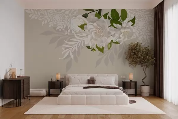 Fototapet vita rosor på en beige mönstrad bakgrund Nr. w03453