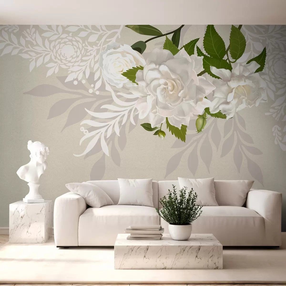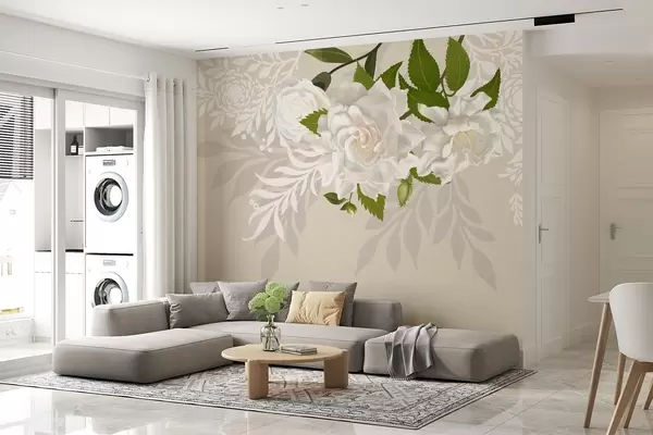 Fototapet vita rosor på en beige mönstrad bakgrund Nr. w03453