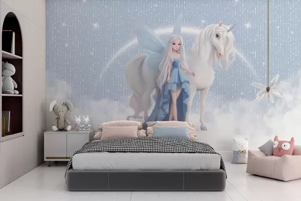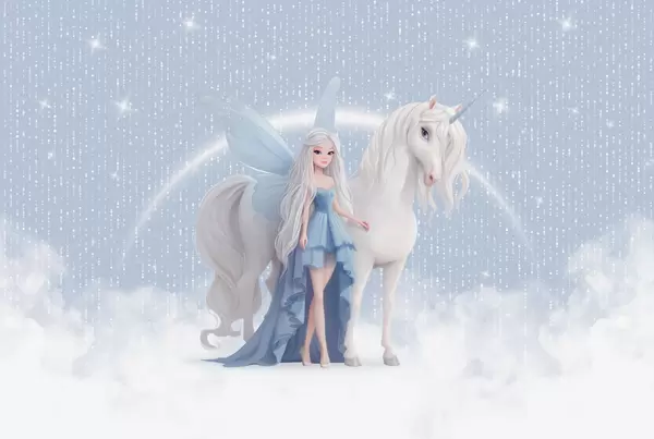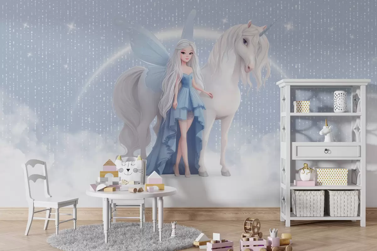 Fototapet En älva med en enhörning bland molnen Nr. w03527v1