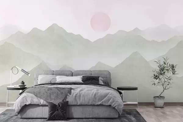 Fototapet Bergslandskap i Boho-stil, solnedgång, mjuk pastell, grönt Nr. w03547