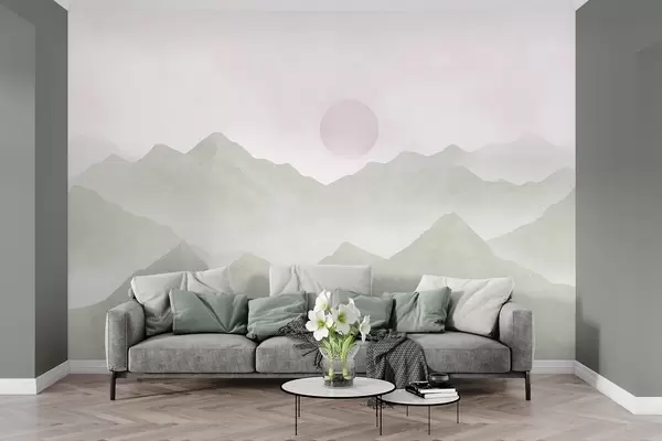 Fototapet Bergslandskap i Boho-stil, solnedgång, mjuk pastell, grönt Nr. w03547