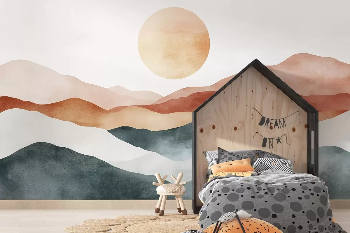 Fototapet Akvarellberg med solen, boho-stil, rött, orange, grått Nr. w03551