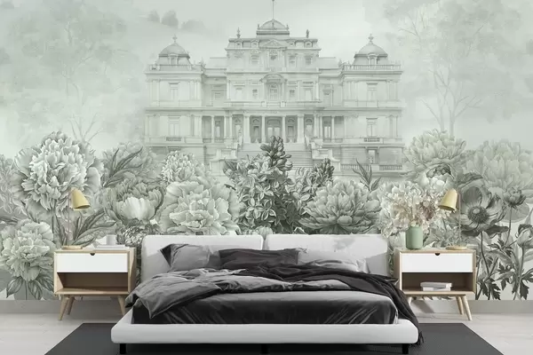 Fototapet Kungligt slott med pionträdgård, akvarellstil, natur, gröna färger, boho Nr. w03552v2