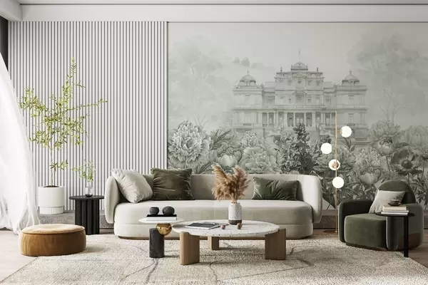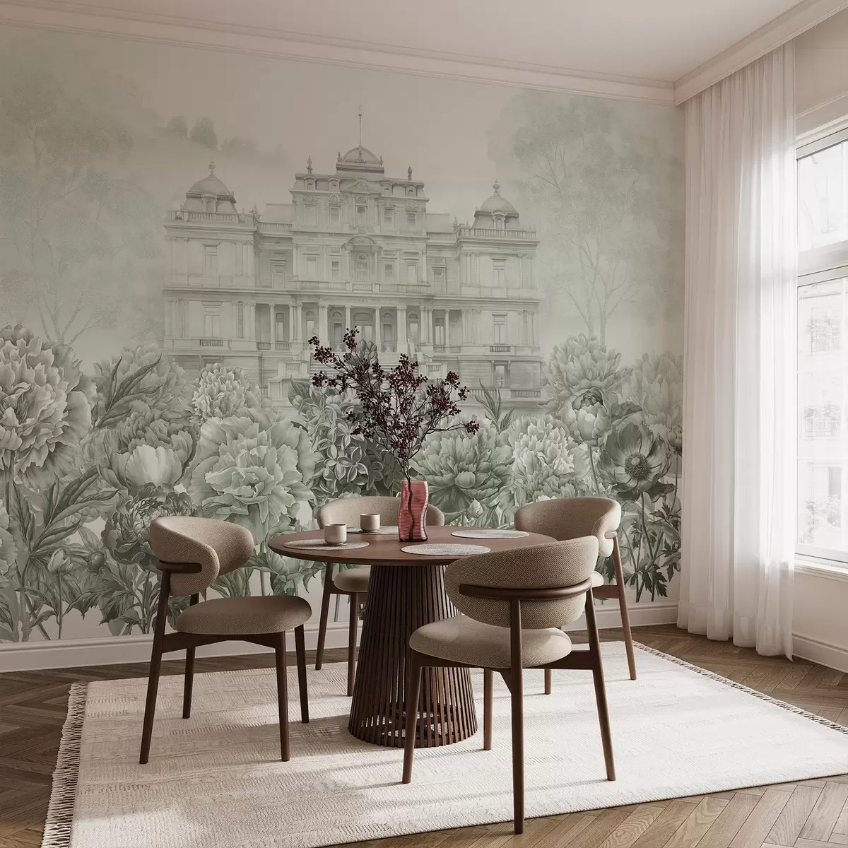 Fototapet Kungligt slott med pionträdgård, akvarellstil, natur, gröna färger, boho Nr. w03552v2