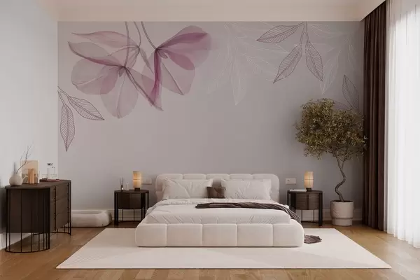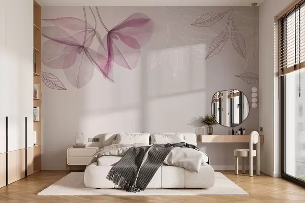 Fototapet skira genomskinliga blommor och blad i lila toner Nr. w03616v4