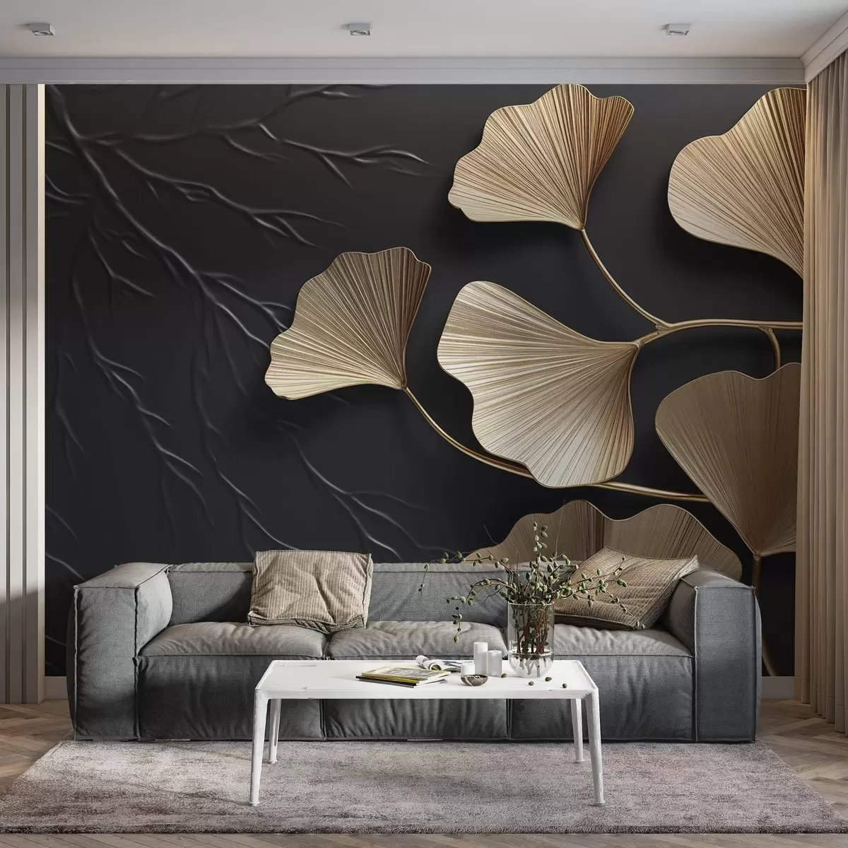Fototapet Volymetriskt bladverk på en mörk vägg Nr. w03650v1