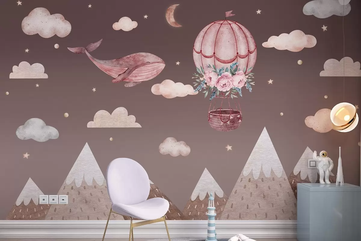 Fototapet Söt val med luftballong, mörk himmel med moln, berg, akvarell, rosa färger Nr. w03673v1