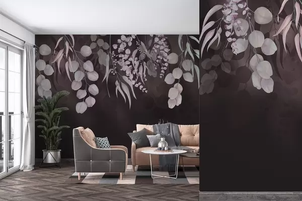 Fototapet Tropiska blad på mörk vinröd bakgrund, blommigt Nr. w03752v1