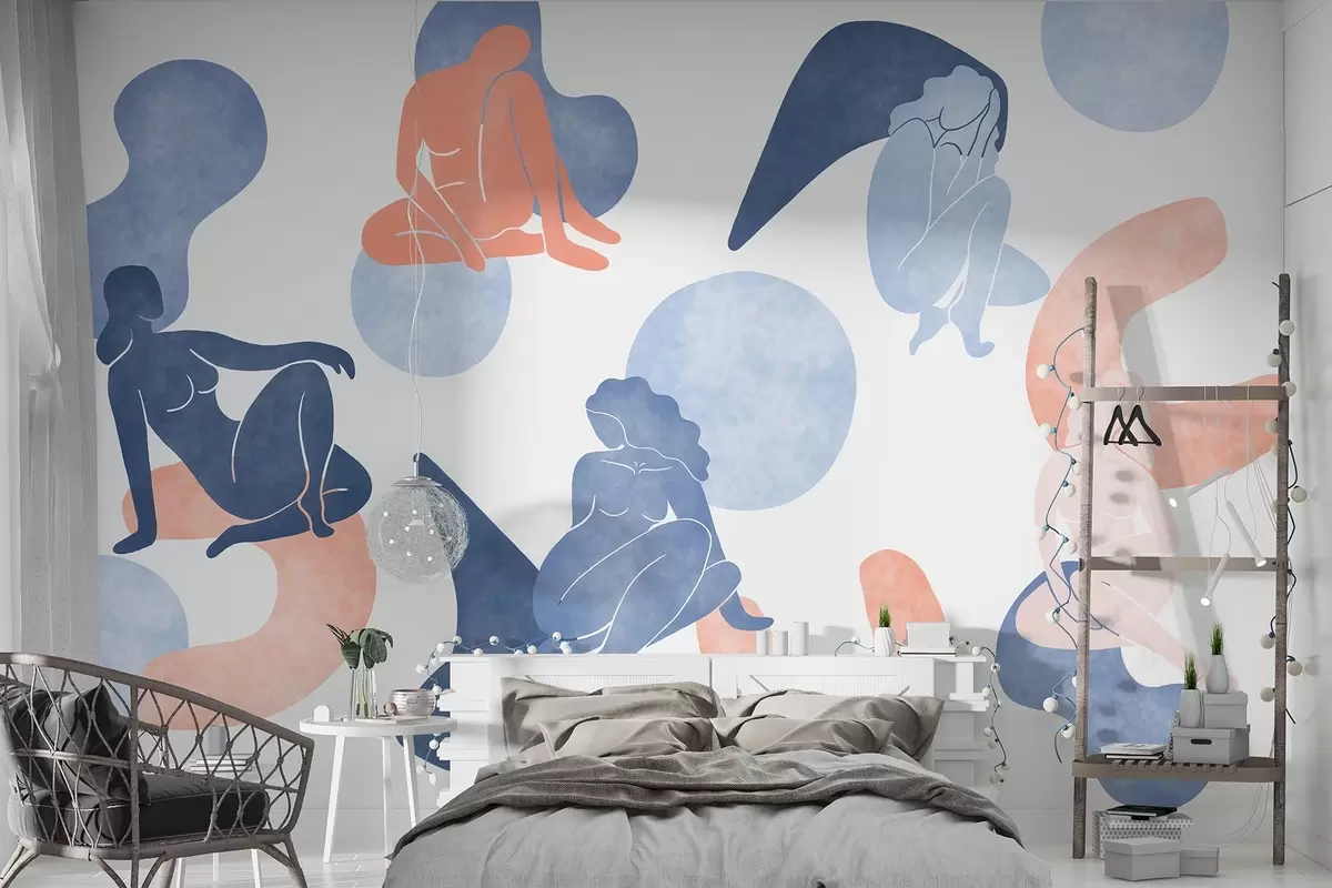Fototapet Geometriska abstraktioner med kvinnliga silhuetter, boho-stil, blått, beige, rosa Nr. w03753v1