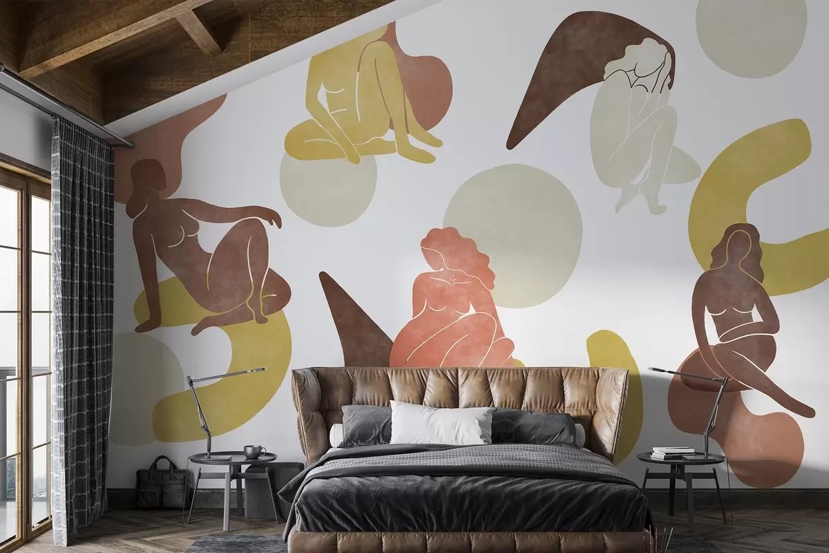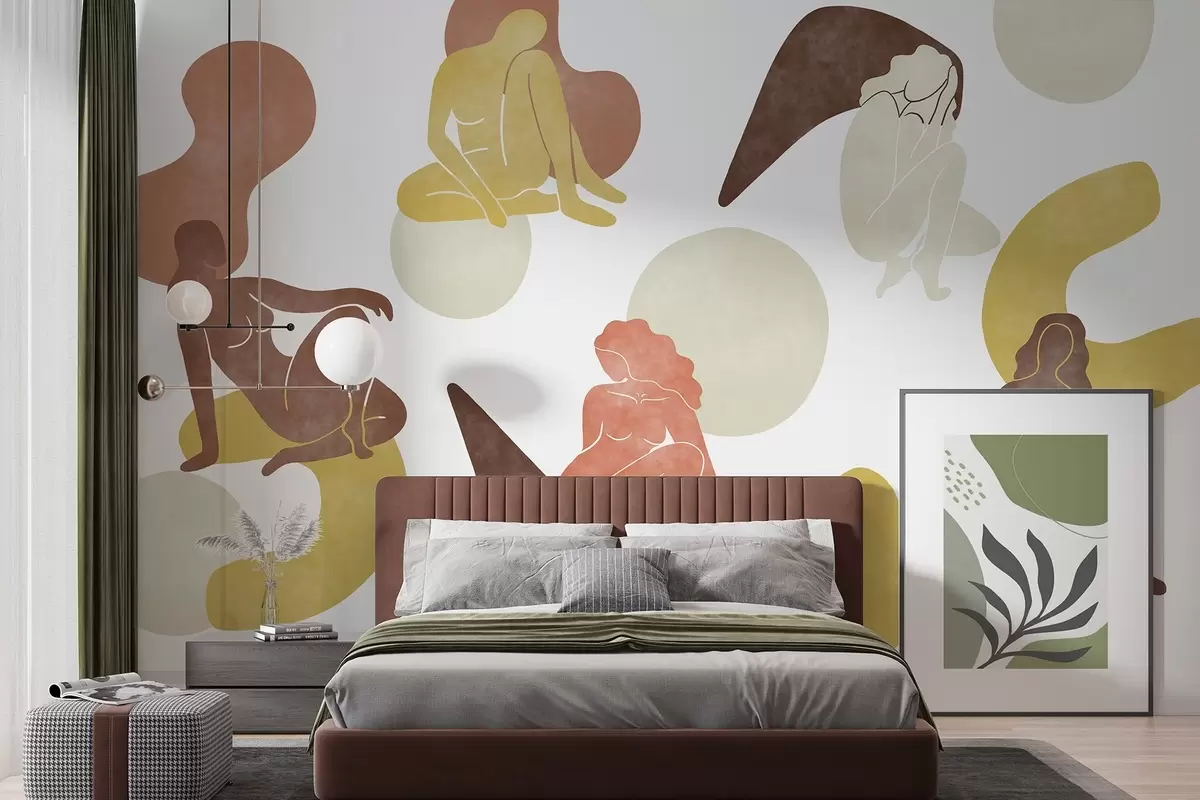 Fototapet Geometriska abstraktioner med kvinnliga silhuetter, boho-stil, brunt, beige, gult Nr. w03753v2