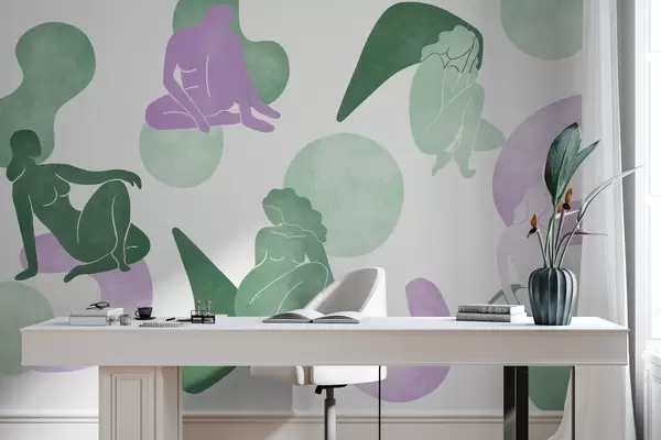 Fototapet Geometriska abstraktioner med kvinnosilhuetter, boho-stil, lila, grönt Nr. w03753v4