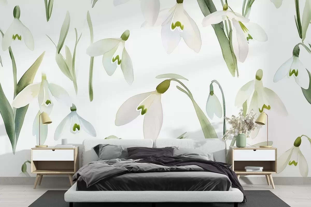 Fototapet Snödroppar blommor i akvarellstil, naturliga färger Nr. w03754