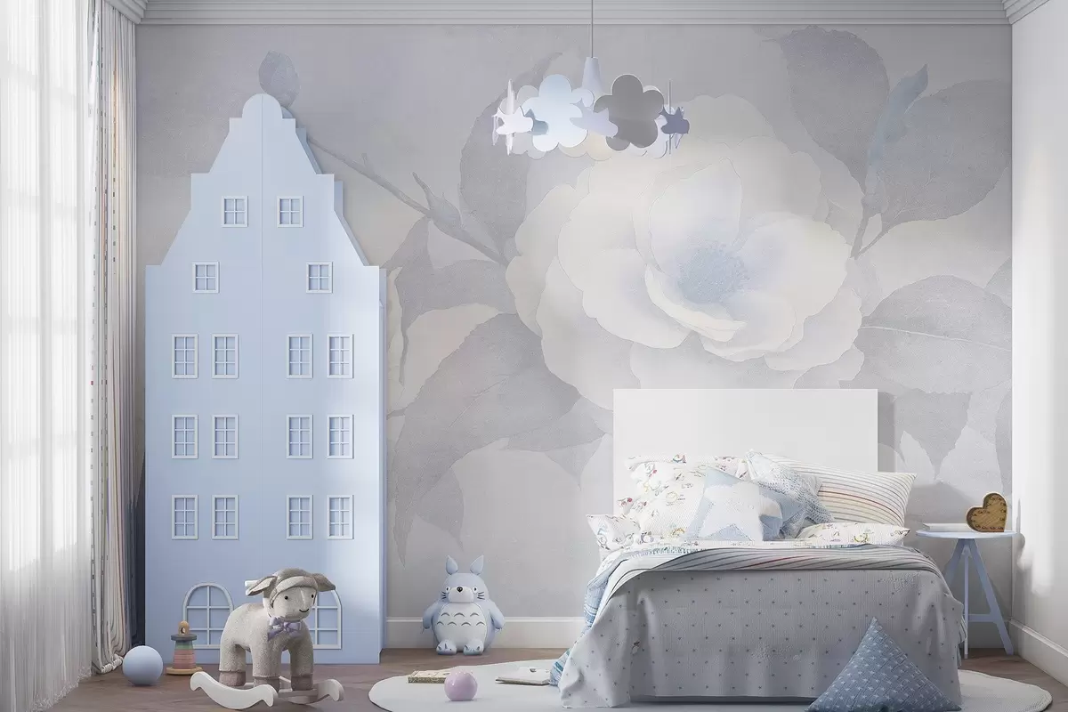 Fototapet Mjuk pastell med kameliablommor på grenen, blå färger Nr. w03760v1