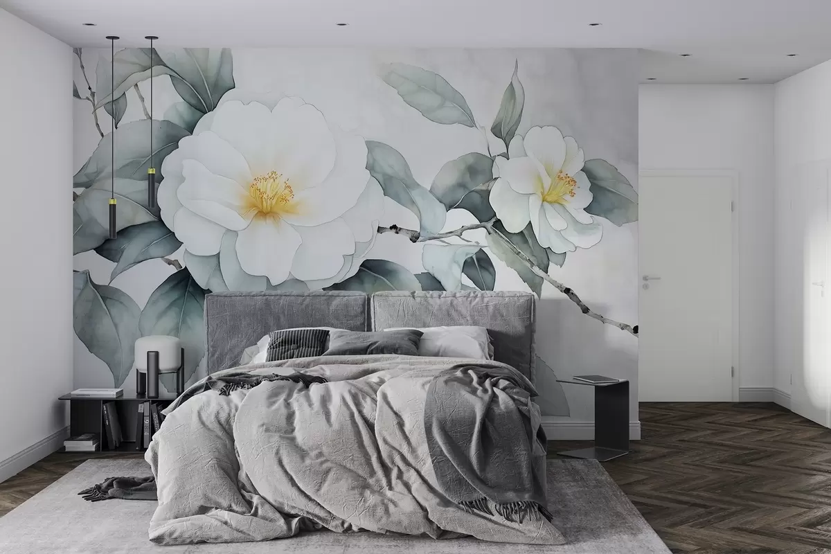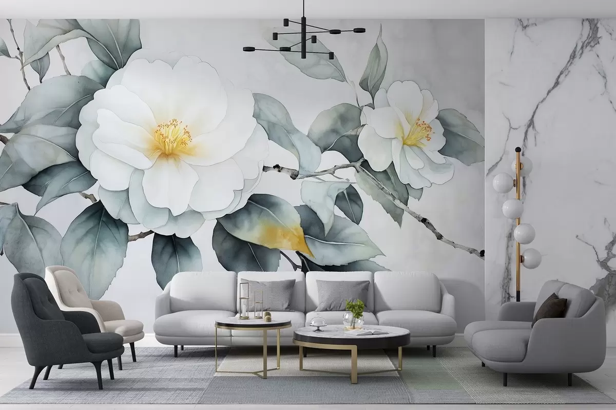 Fototapet Kameliablommor på gren i akvarellstil, naturliga färger Nr. w03761