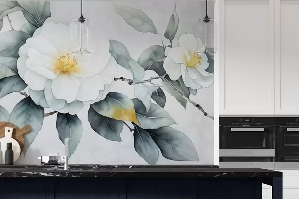 Fototapet Kameliablommor på gren i akvarellstil, naturliga färger Nr. w03761