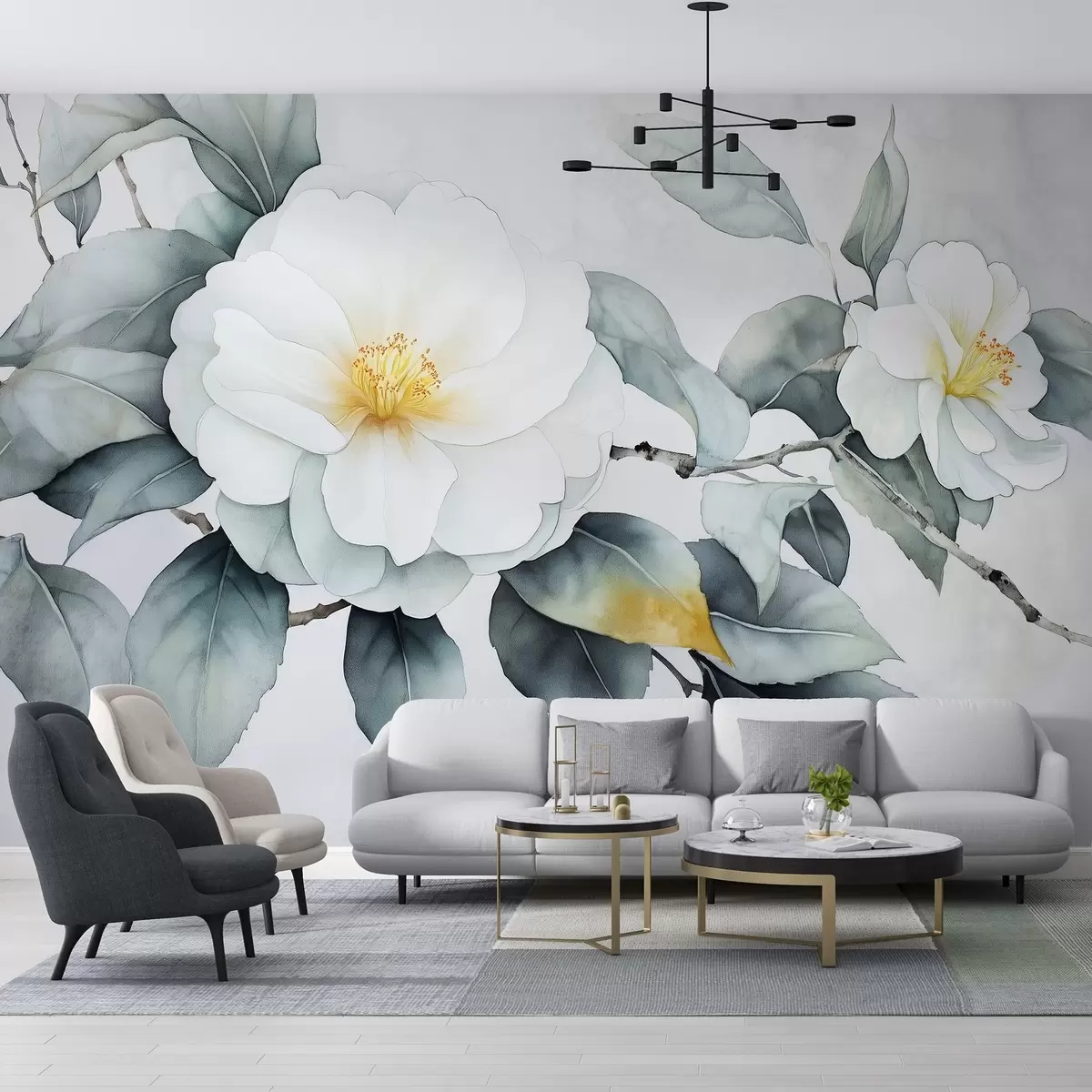 Fototapet Kameliablommor på gren i akvarellstil, naturliga färger Nr. w03761