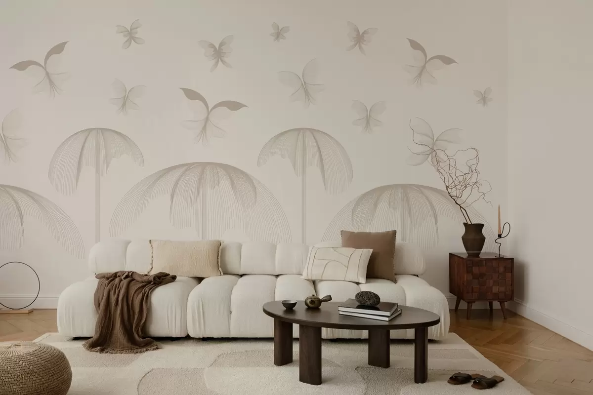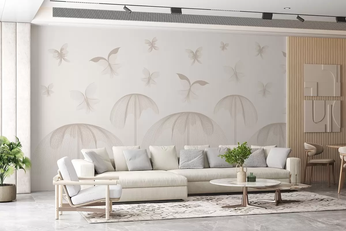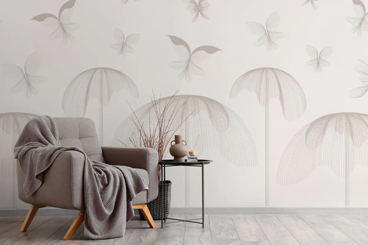 Fototapet minimalistisk linjär tapet fjärilar och fontäner på en mjölkig bakgrund Nr. w03762
