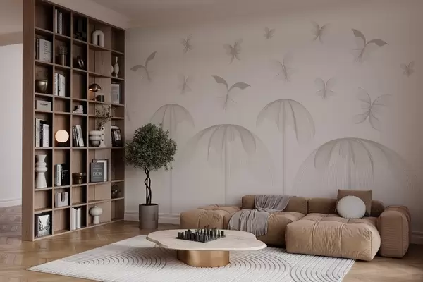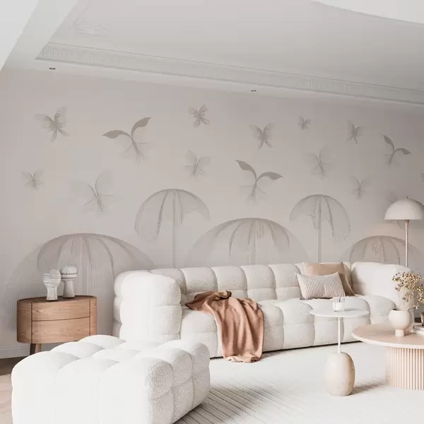 Fototapet minimalistisk linjär tapet fjärilar och fontäner på en mjölkig bakgrund Nr. w03762