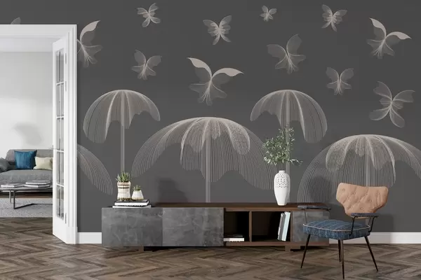Fototapet minimalistisk linjär tapet fjärilar och fontäner på en mörkgrå bakgrund Nr. w03762v1