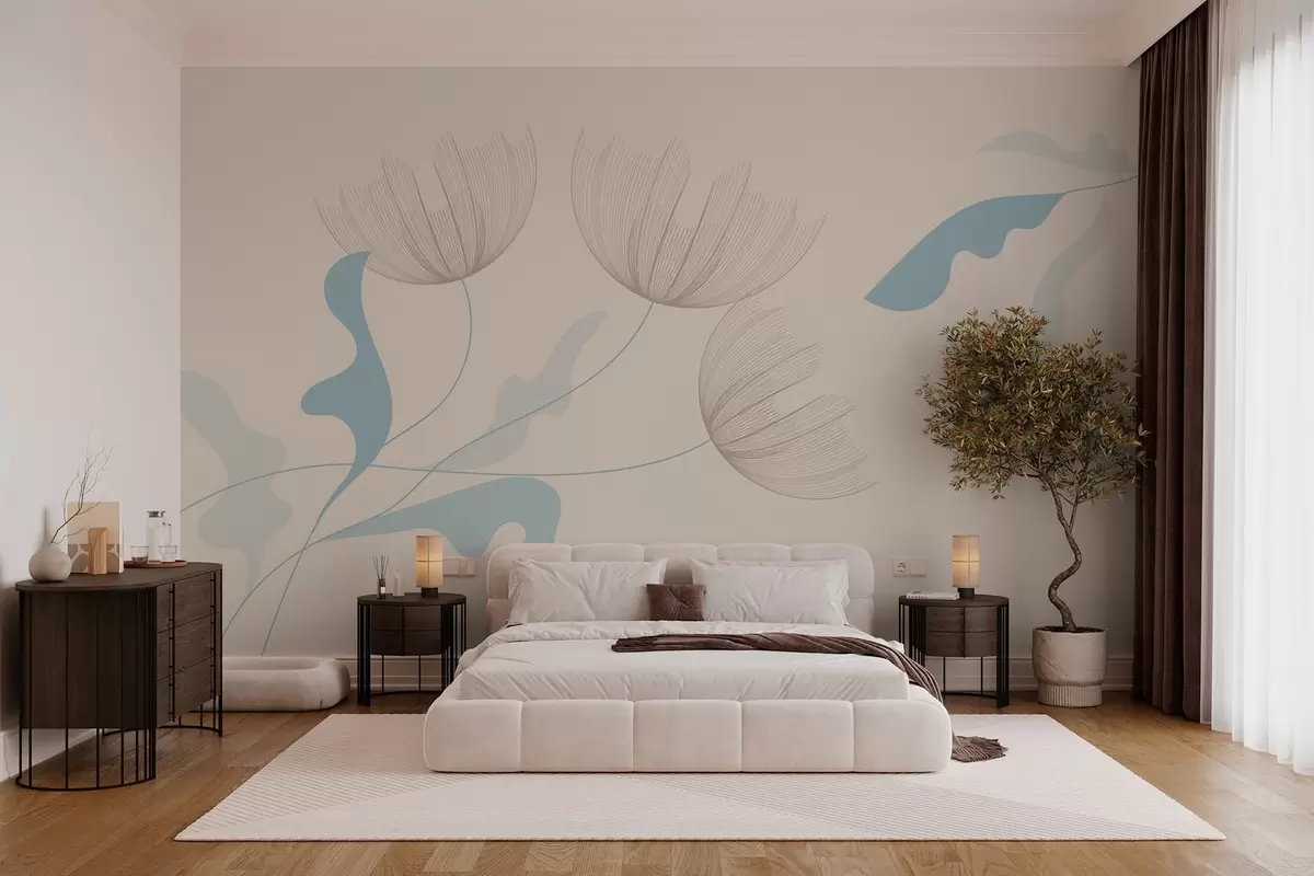 Fototapet eleganta minimalistiska blommor i ljusblå toner på en beige bakgrund Nr. w03763v1