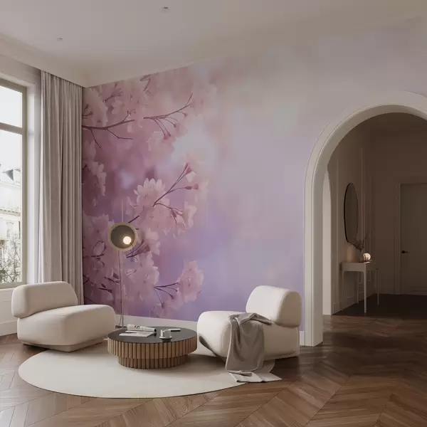 Fototapet Sakuragrenar med rosa blommor på pastellfärgad bakgrund Nr. w03804