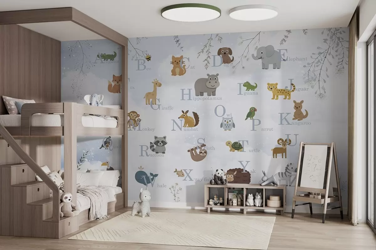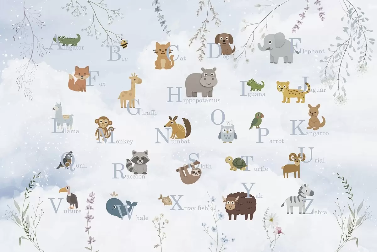 Fototapet Alfabet med blå bokstäver, växter och himmel Nr. w03809v1
