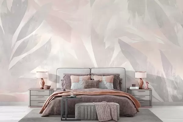 Fototapet Tropiska blad, blommor, palmer, pastellstil, rosa och beige färger Nr. w03881