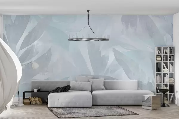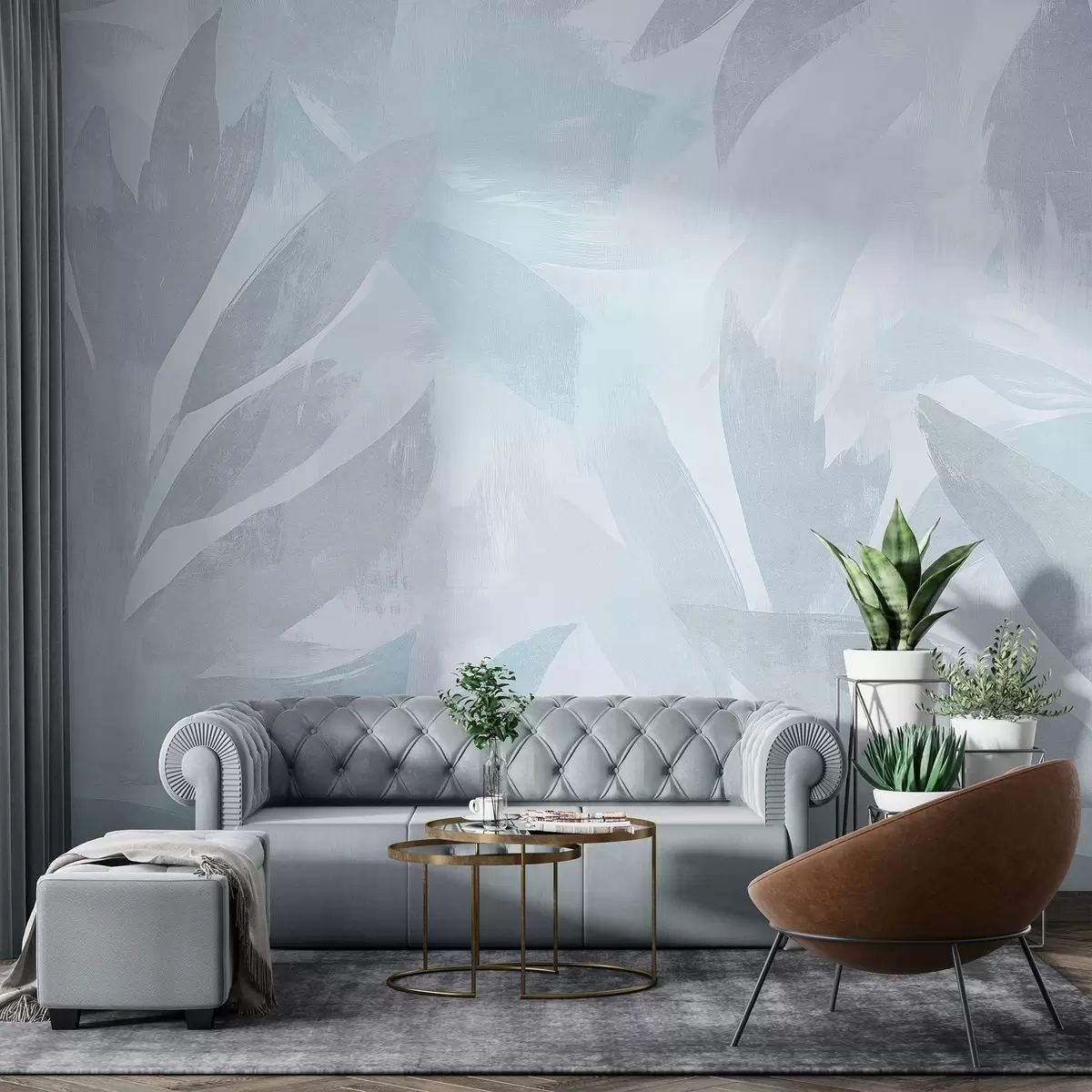 Fototapet Tropiska blad, blommor, palmer, pastellfärgad stil, blå färger Nr. w03881v2