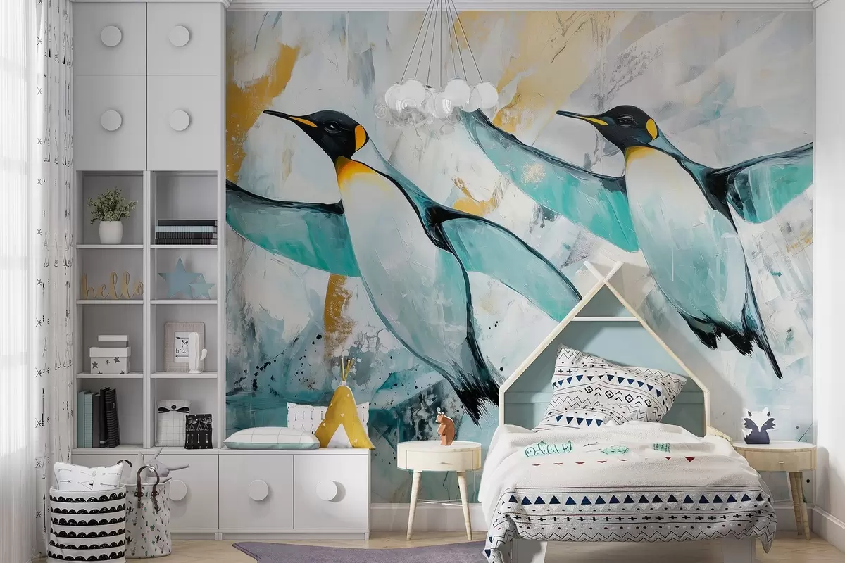 Fototapet Söta pingviner, Antarktis, blå is, djur, oljeteckning Nr. w03883