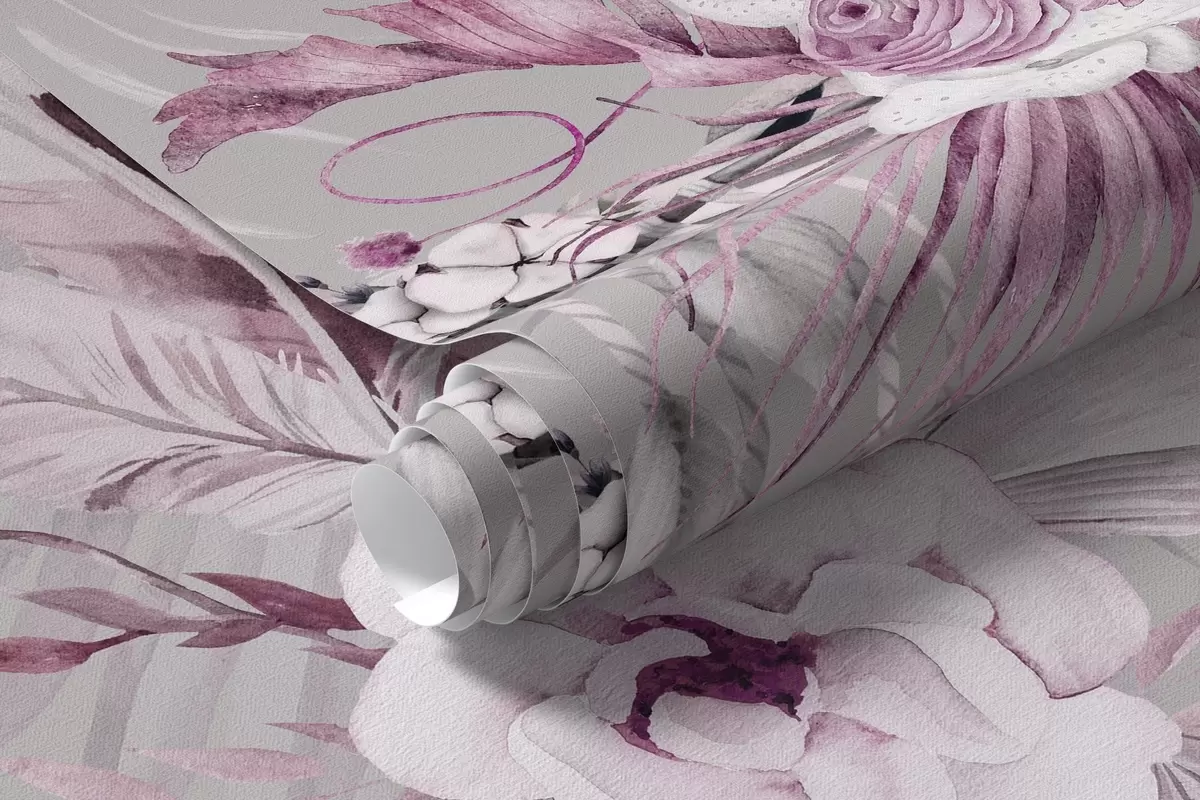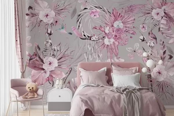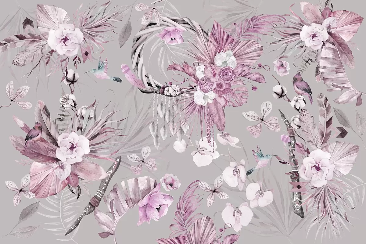 Fototapet Prydnad i boho-stil med pionblommor och fåglar, akvarellstil, rosa färger Nr. w03885v1