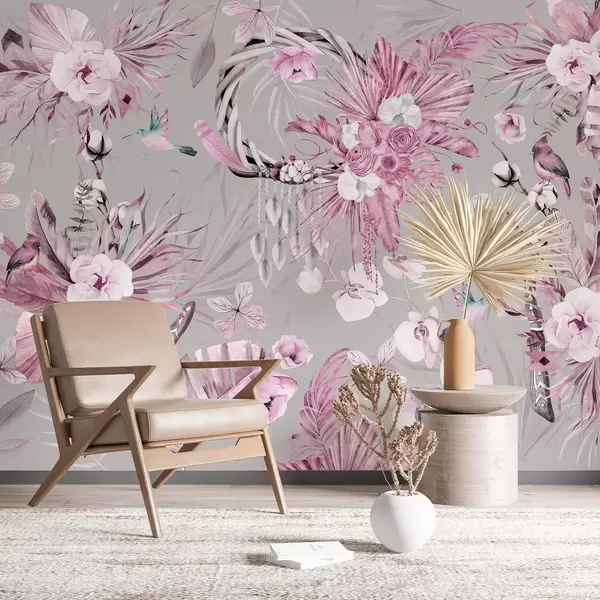 Fototapet Prydnad i boho-stil med pionblommor och fåglar, akvarellstil, rosa färger Nr. w03885v1