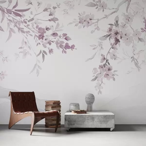 Fototapet Blommande grenar, imitation av akvarell, lila-rosa nyanser Nr. w03935v1