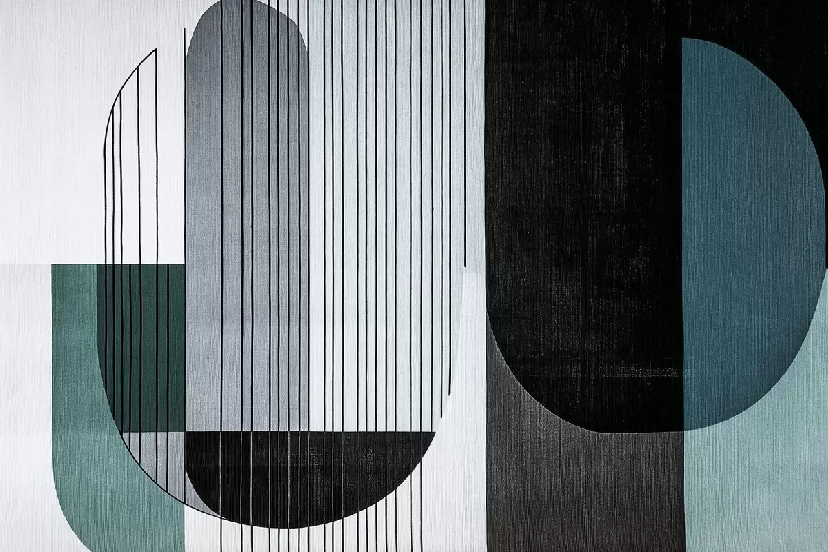 Fototapet modern abstrakt geometrisk komposition med överlappande former och vertikala linjemönster, tunna linjer som fyller trapezoider och ovaler, mjuk textiltextur, varma dämpade toner som olivgrönt, taupe, beige och kol, subtila transparenseffekter mellan formerna Nr. w03937v2