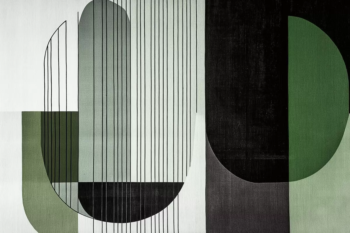 Fototapet modern abstrakt geometrisk komposition med överlappande former och vertikala linjemönster, tunna linjer som fyller trapezoider och ovaler, mjuk textiltextur, varma dämpade toner som olivgrönt, taupe, beige och kol, subtila transparenseffekter mellan formerna Nr. w03937v3