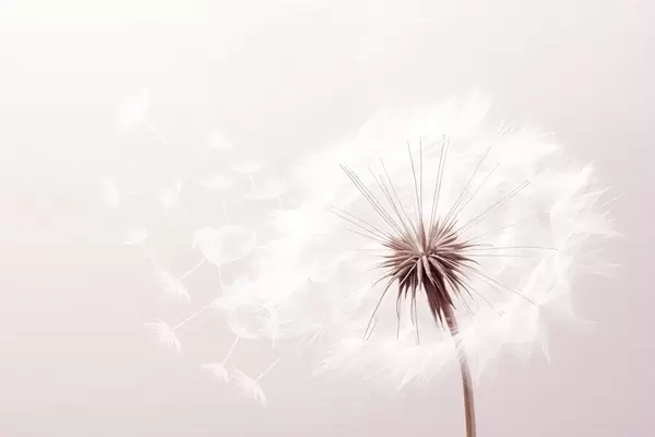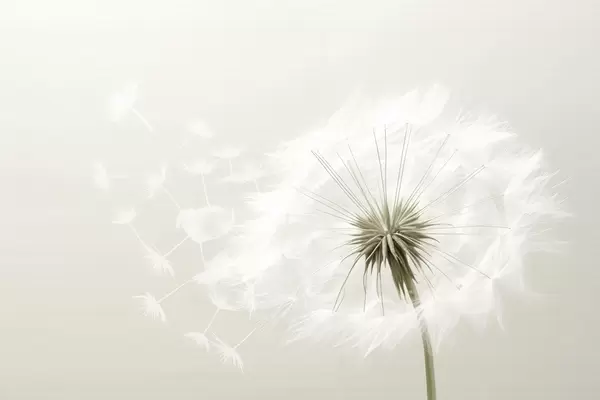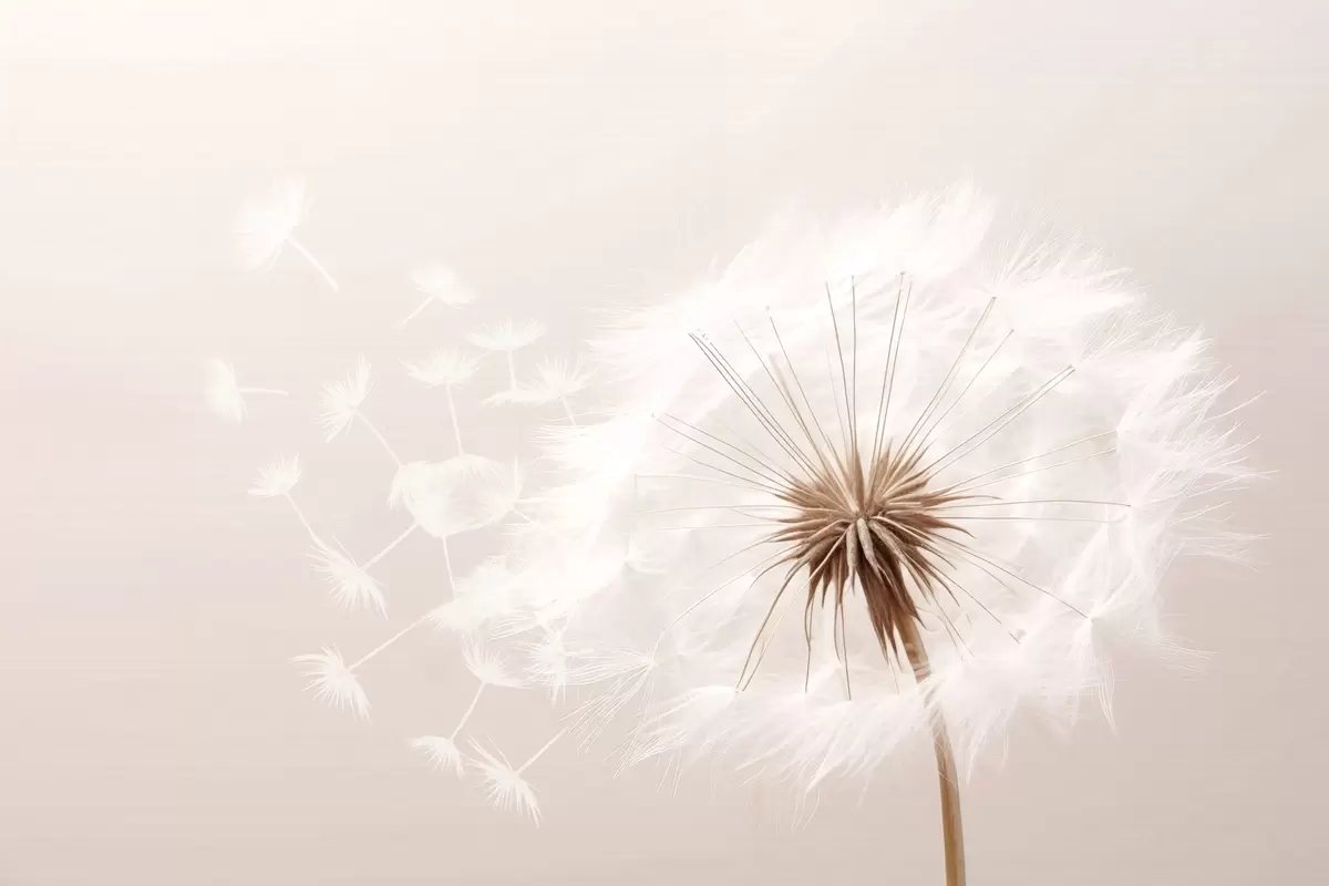Fototapet Modern mjuk blomsterkomposition med ett fullblommat maskroshuvud och flytande frön, mot en delikat textilliknande textur Nr. w03939