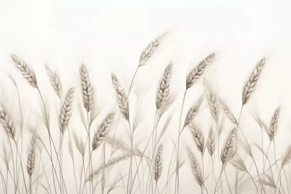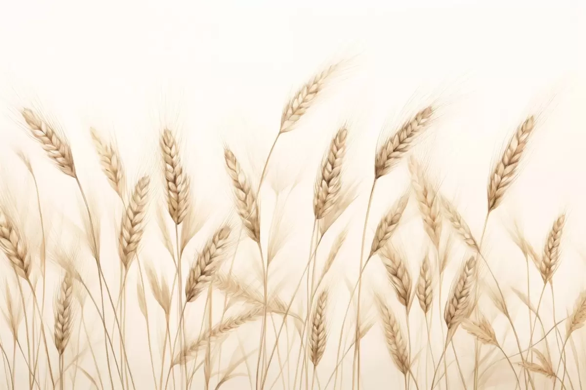 Fototapet delikat botanisk illustration av vetestjälkar, handritad stil, fina linjer med pastellkritstruktur, mjuka sepia- och jordbruna toner, vit bakgrund, symmetrisk elegant komposition, naturlig skissestetik Nr. w03943