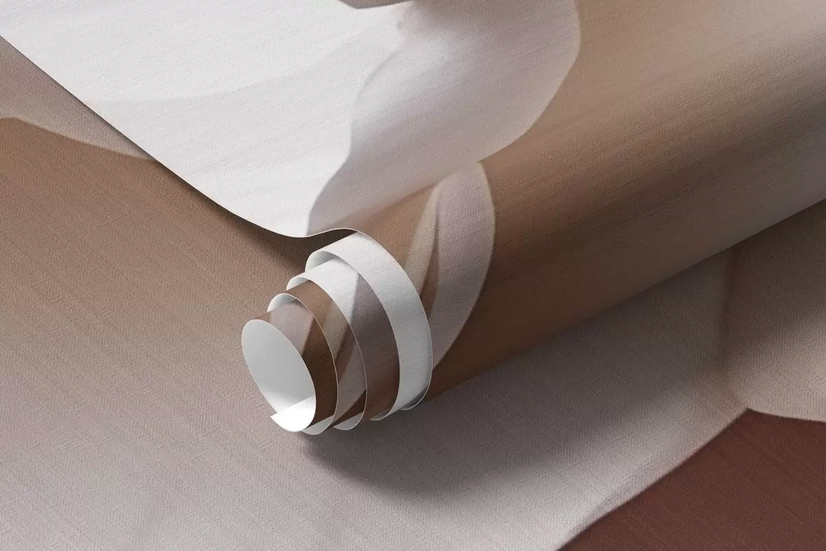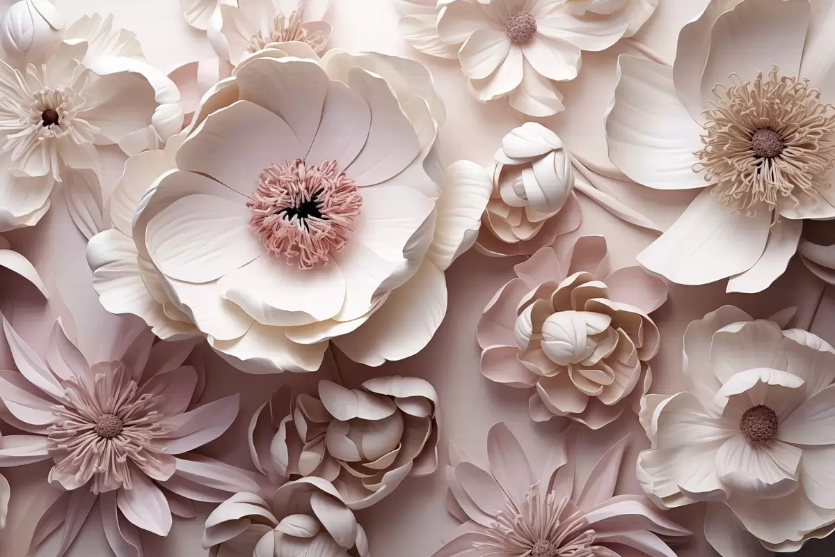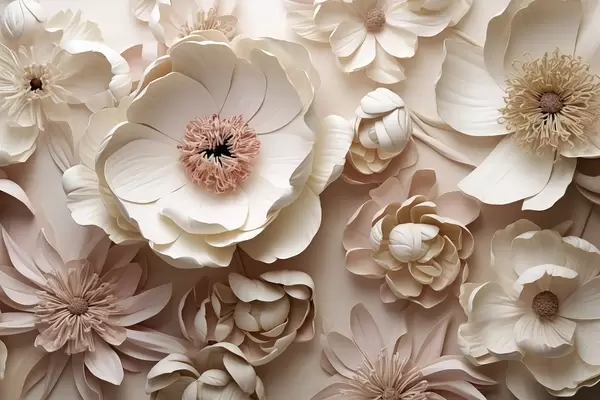 Fototapet Volymetrisk blomkomposition med delikata pappersliknande eller textilinspirerade kronblad i elfenben, vanilj och rodnad, mot en varm beige duk. Nr. w03945v1