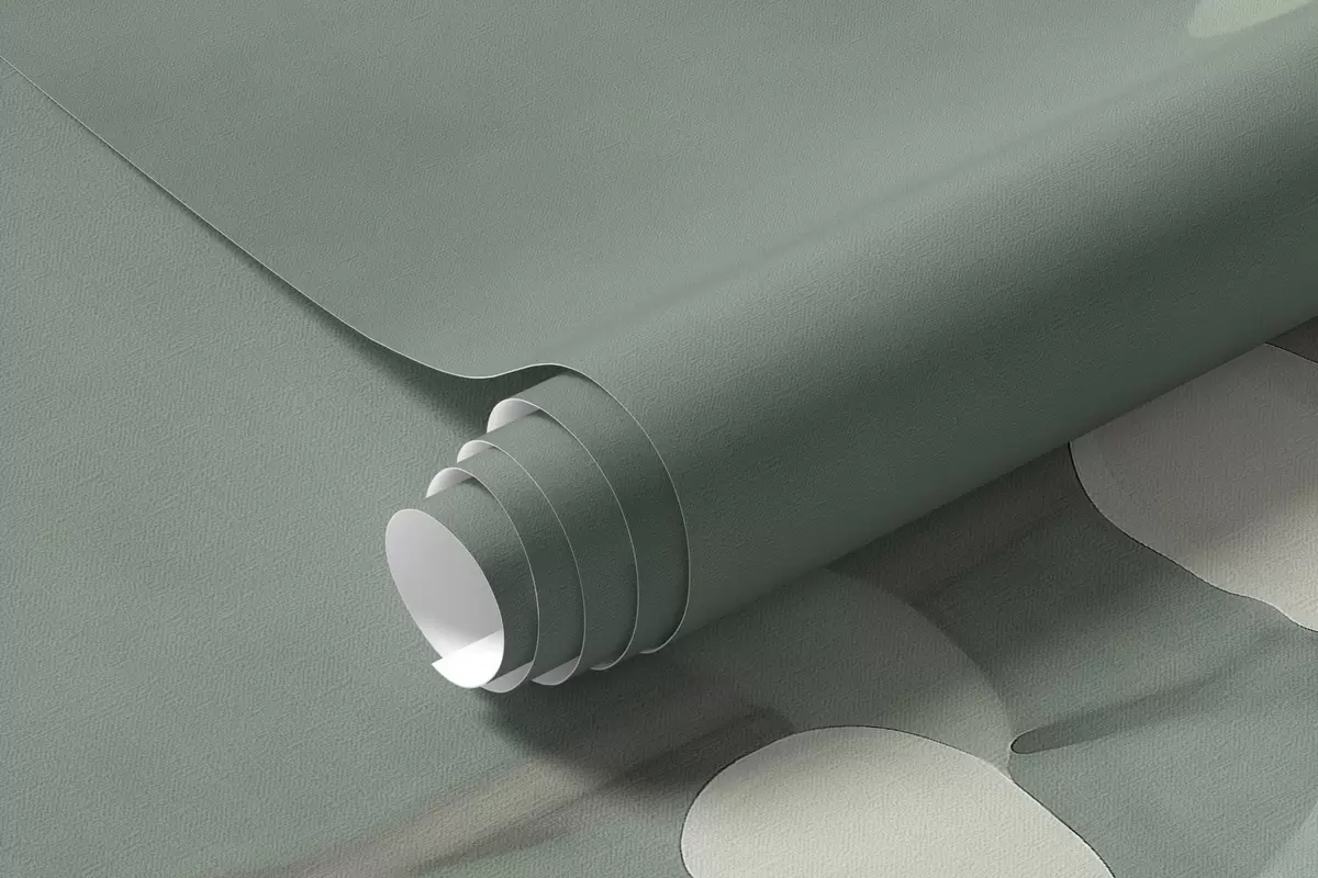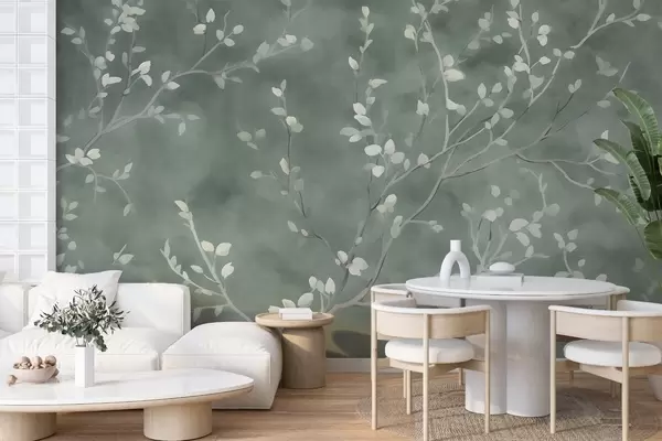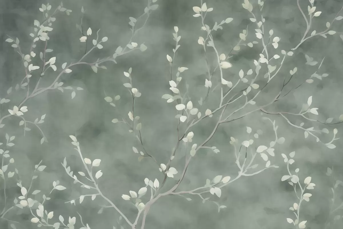 Fototapet minimalistisk handmålad tapetdesign av mjuka vita trädgrenar med skira blad, som förgrenar sig organiskt över en dämpad salviagrön bakgrund, fina botaniska linjer i naturligt flöde Nr. w03949