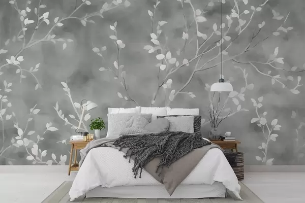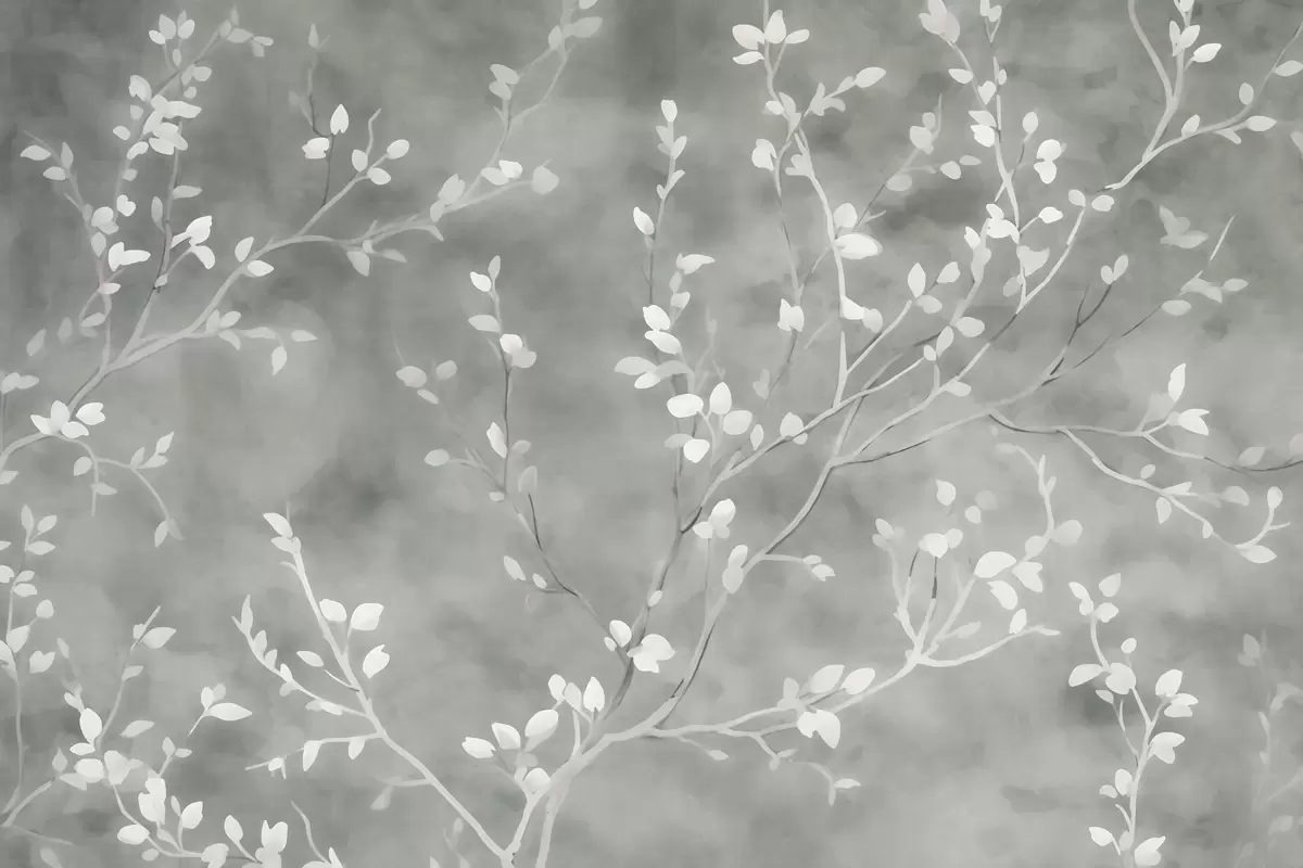 Fototapet minimalistisk handmålad tapetdesign av mjuka vita trädgrenar med skira blad, som förgrenar sig organiskt över en dämpad salviagrön bakgrund, fina botaniska linjer i naturligt flöde Nr. w03949v2