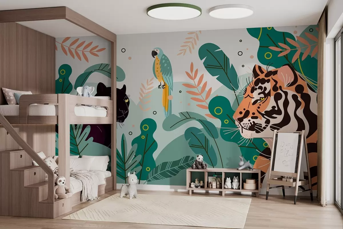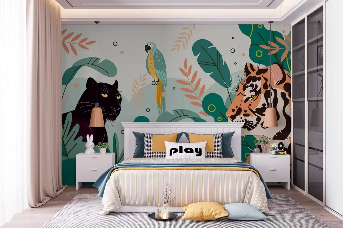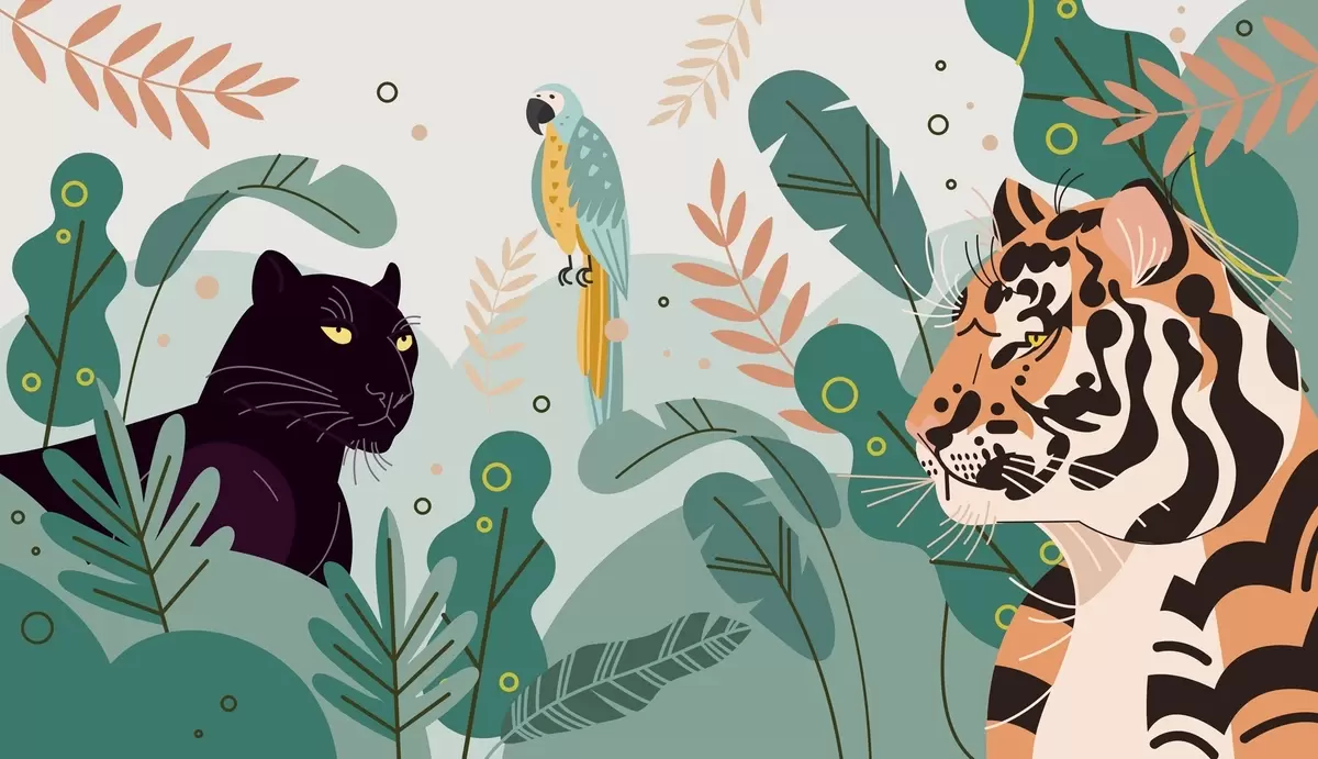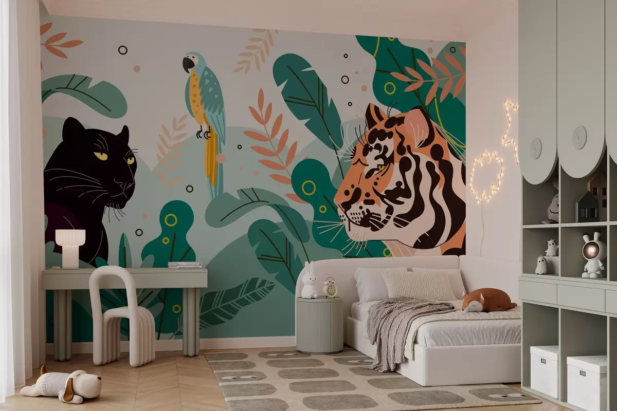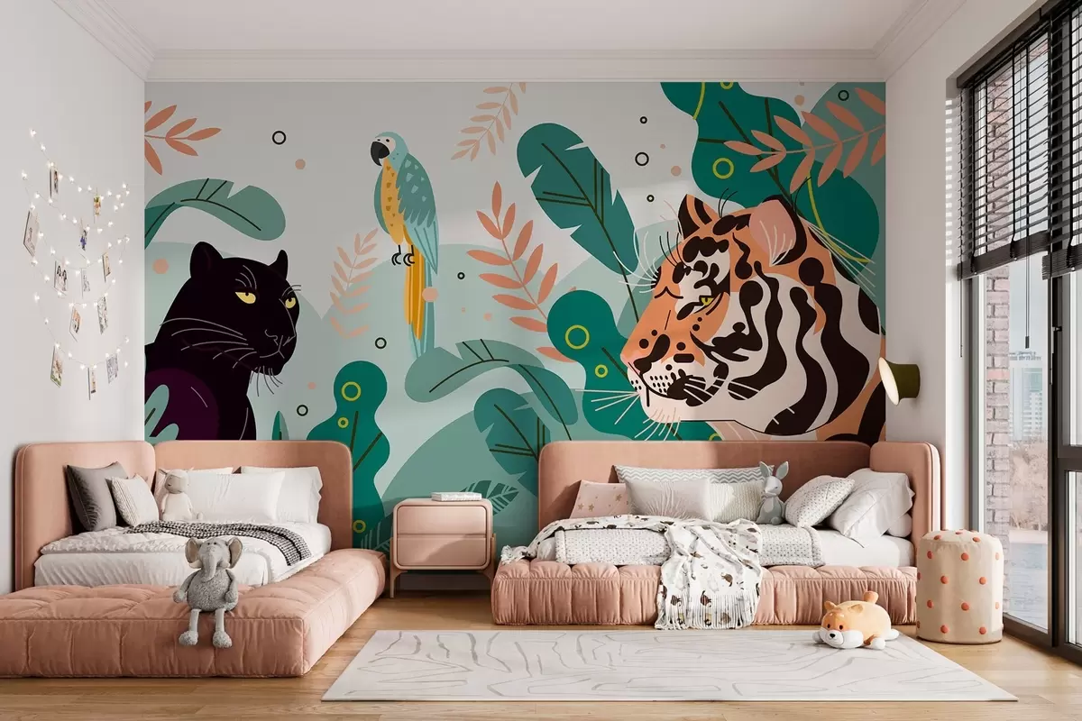 Fototapet djungel med tiger, panter och papegoja Nr. w03958