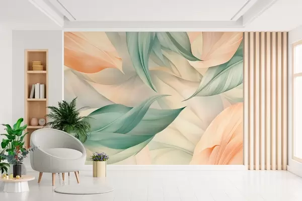 Fototapet exotiska tropiska blad i fina persiko- och gröna toner Nr. w03962