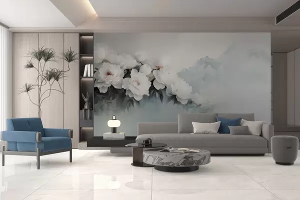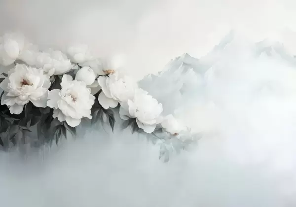 Fototapet pittoreska frodiga vita pioner mot bakgrunden av dimmiga berg Nr. w03965