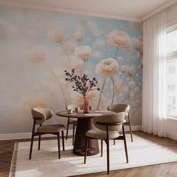 Fototapet Fina gräddfärgade rosor på en ljusblå bakgrund Nr. w03997
